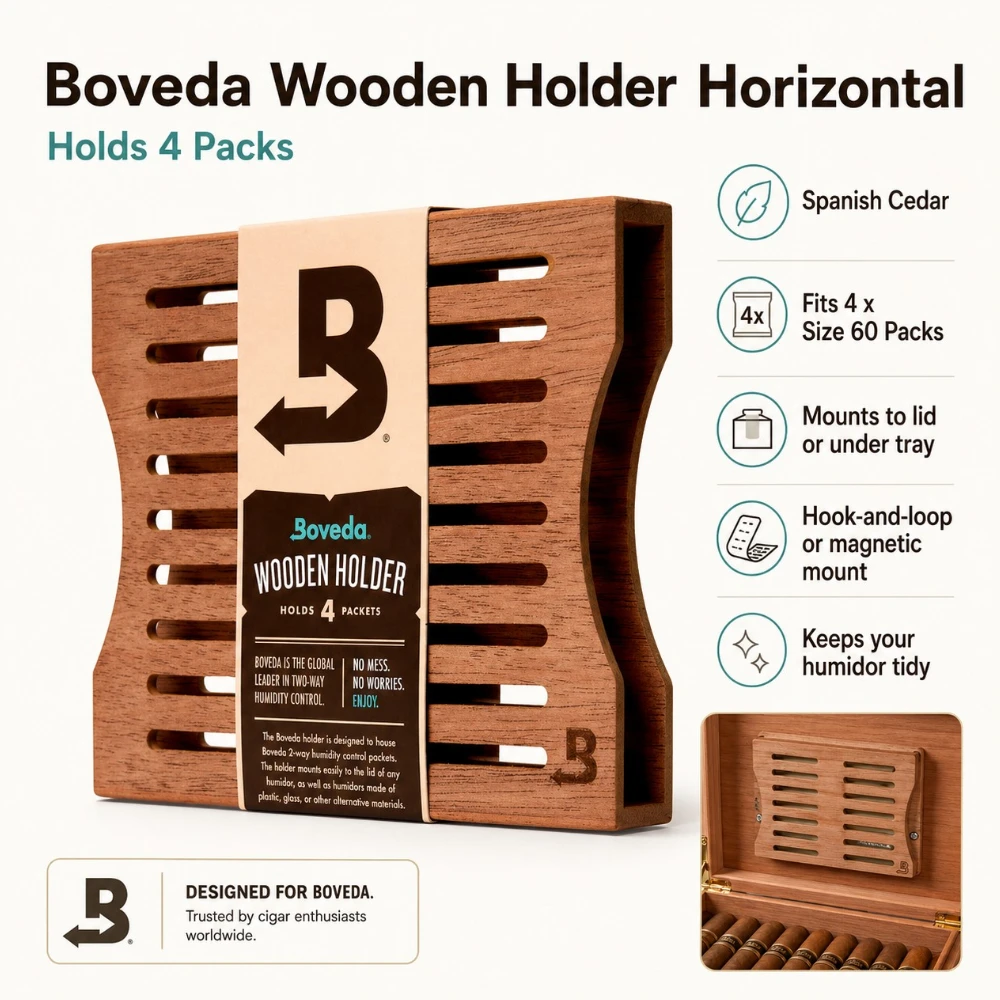 Each holder fits four Size 60 Boveda packs, providing ideal 2-way humidity control for larger humidors. The natural cedar wood also adds a refined look and a gentle aroma that complements your cigars.